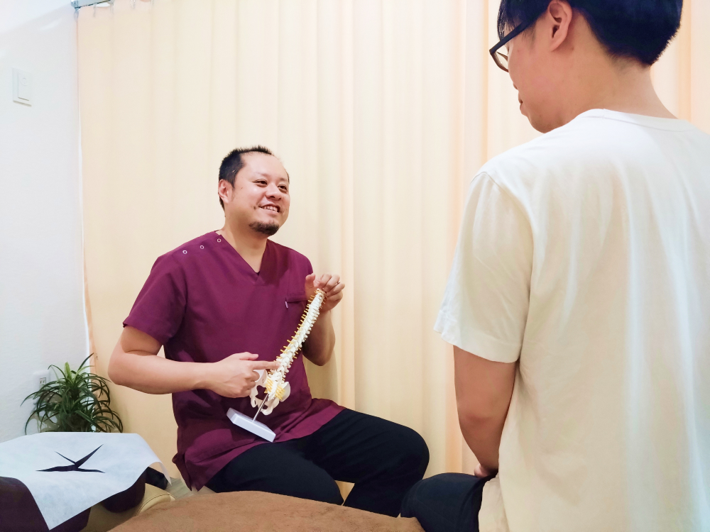 一般的な施術と異なり、腰だけでなく肩や首の調整も行うことで全身のバランスを整えます。
